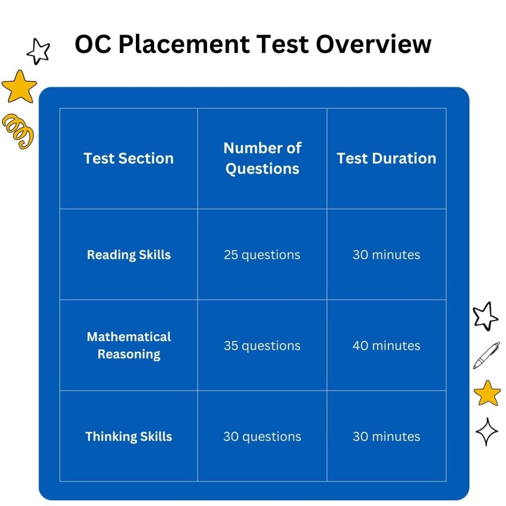 The Opportunity Class (OC) Placement Test is divided into three timed sections, each designed to assess a different set of skills. All sections are multiple-choice and must be completed under strict time limits, making preparation and strategy essential.